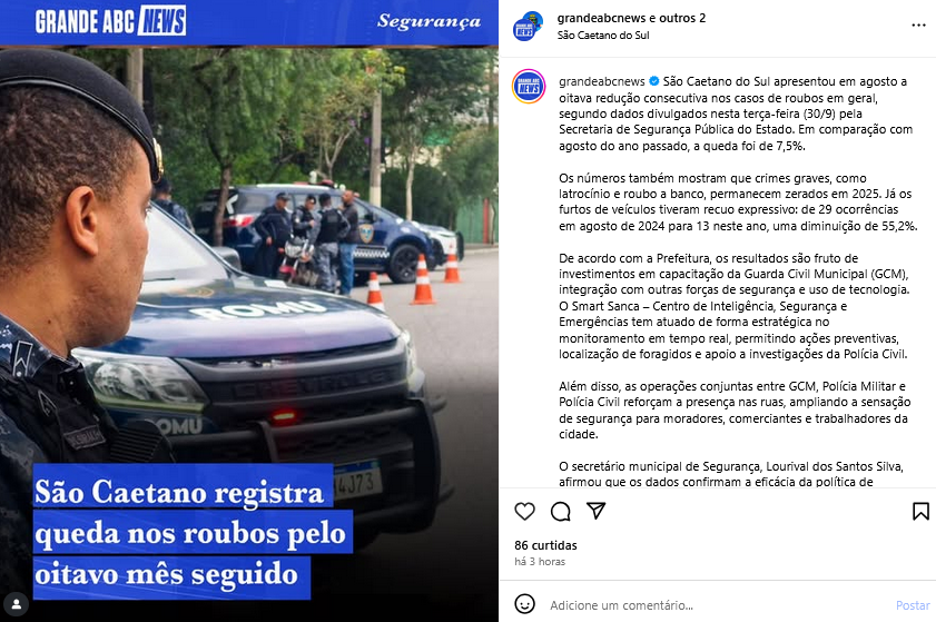 São Caetano registra queda nos roubos pelo oitavo mês seguido