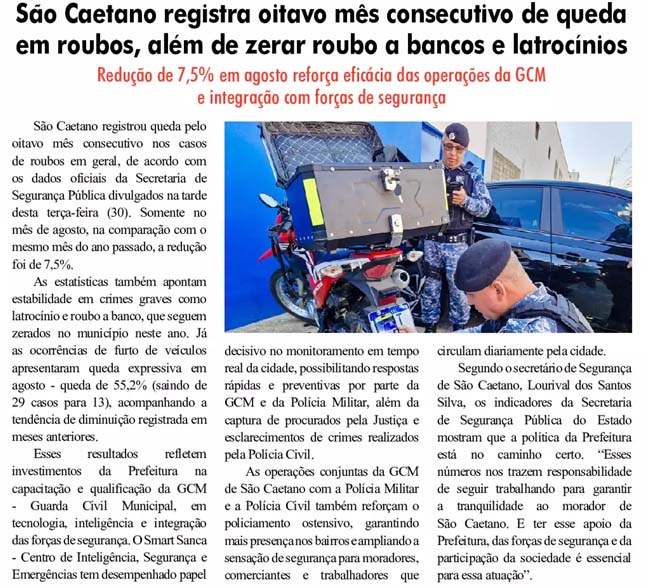 São Caetano registra oitavo mês consecutivo de queda em roubos, além de zerar roubo a bancos e latrocínios