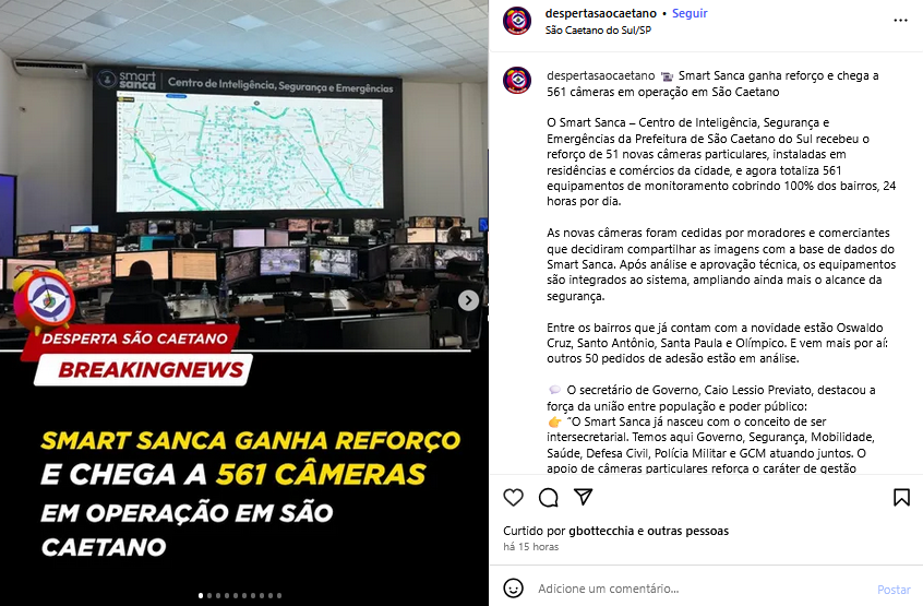 Smart Sanca ganha reforço e chega a 561 câmeras em operação em São Caetano