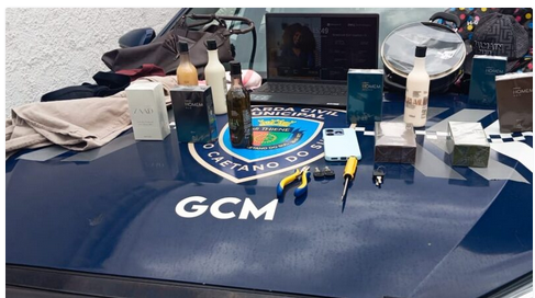 Com a mulher, os GCMs encontraram uma sacola contendo diversos produtos de lojas diferentes, além de ferramentas utilizadas para a prática dos furtos. Entre os itens apreendidos estava um notebook, cuja procedência foi identificada pelos GCMs como sendo de um furto ocorrido em São Bernardo do Campo, o que reforça a atenção e o comprometimento da equipe durante a ocorrência.