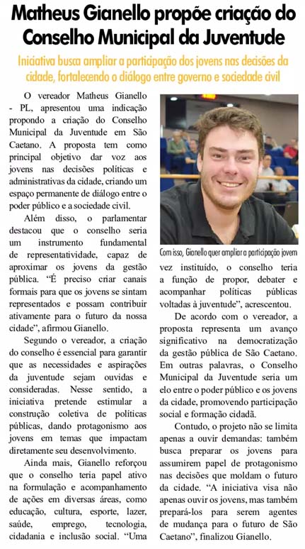 Matheus Gianello propõe criação do Conselho Municipal da Juventude