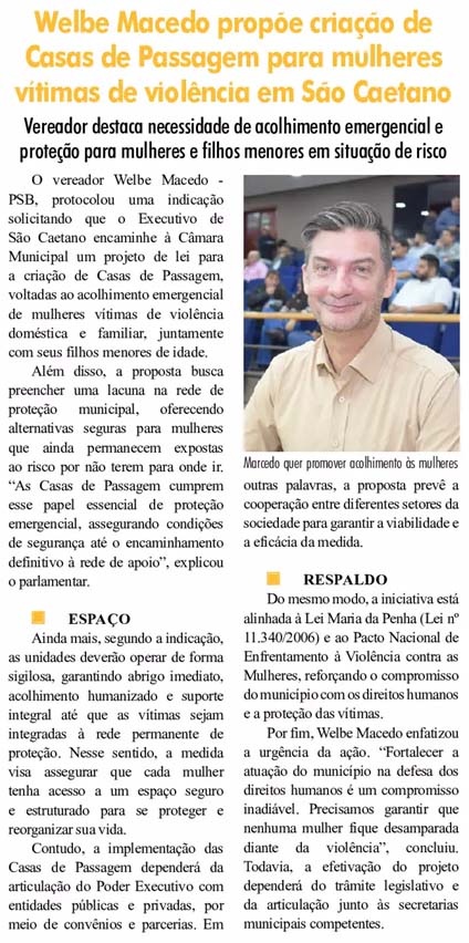 Welbe Macedo propoe criação de Casas da Passagem para mulheres vítimas de violência em São Caetano
