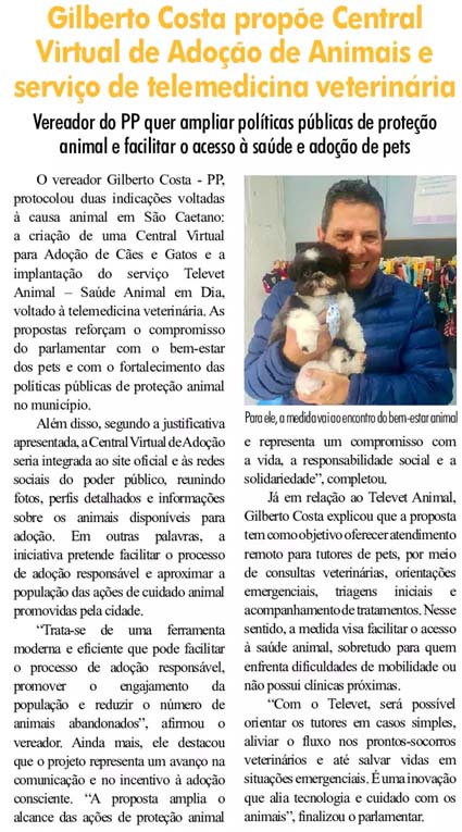 Gilberto Costa propõe Central Virtual de Adoção de Animais e serviço de telemedicina veterinária