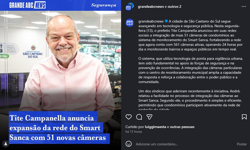 Tite Campanella anuncia expansão da rede do Smart Sanca com 51 novas câmeras