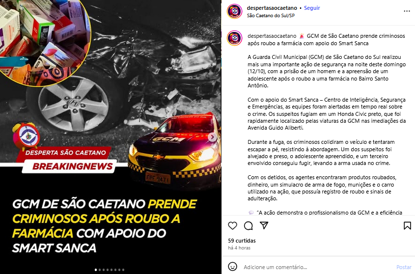 GCM de São Caetano prende criminosos após roubo a farmácia com apoio do Smart Sanca