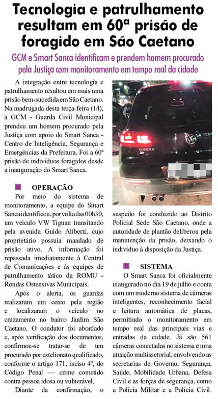 Tecnologia e patrulhamento resultam em 60ª prisão de foragidos em São Caetano