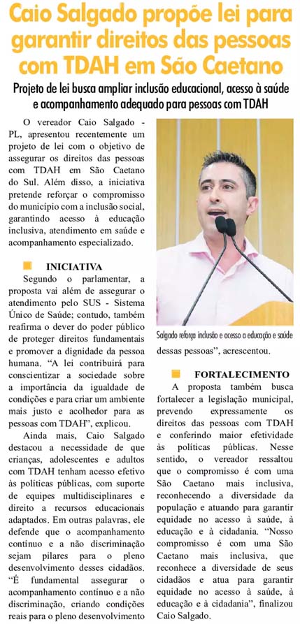 Caio Salgado propõe lei para garantir direitos das pessoas com TDAH em São Caetano