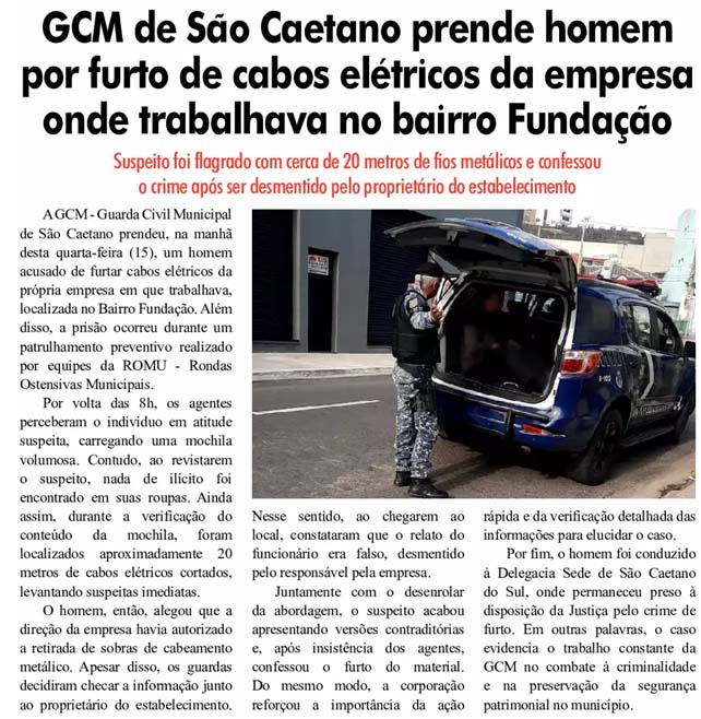 GCM de São Caetano prende homem por furto de cabos elétricos da empresa onde trabalhava no Bairro Fundação