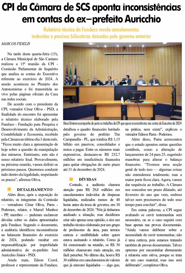 CPI da Câmara de SCS aponta inconsistências em contas do ex-prefeito Auricchio