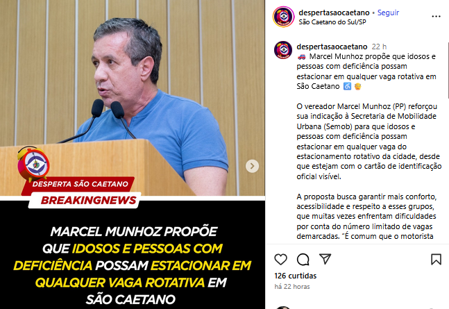 Marcel Munhoz propõe que idosos e pessoas com deficiência possam estacionar em qualquer vaga rotativa em São Caetano