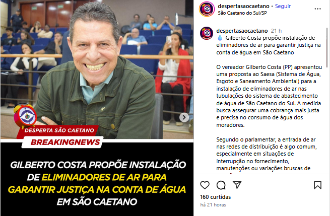 Gilberto Costa propõe instalação de eliminadores de ar para garantir justiça na conta de água em São Caetano