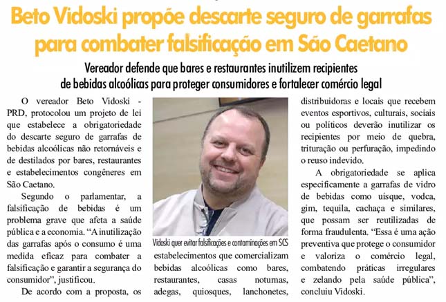 Beto Vidoski propõe descarte seguro de garrafas para combater falsificação em São Caetano