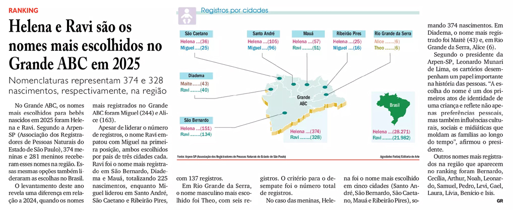 Helena e Ravi são os nomes mais escolhidos no Grande ABC em 2025