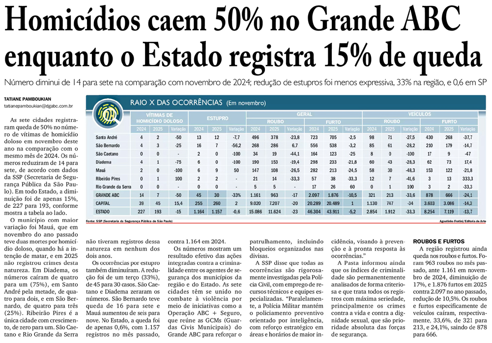 Homicídios caem 50% no Grande ABC enquanto o Estado registra 15% de queda
