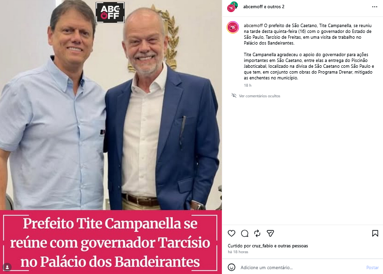 Prefeito Tite Campanella se reúne com governador Tarcísio no Palácio dos Bandeirantes