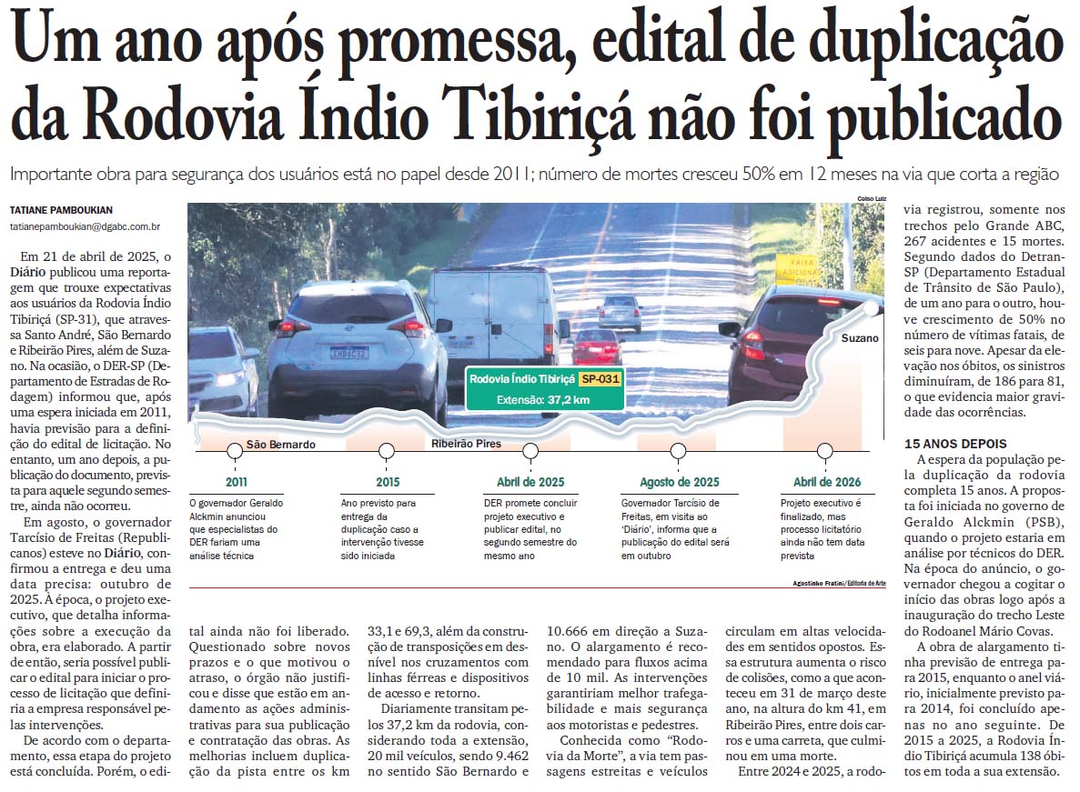 Um ano após promessa, edital de duplicação da Rodovia Índio Tibiriçá não foi publicado