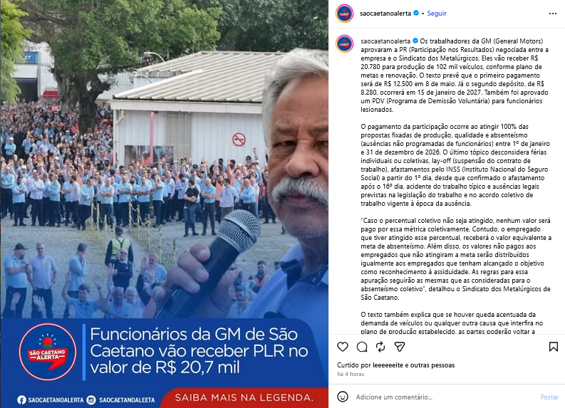 Funcionários da GM de São Caetano vão receber PLR no valor de R$ 20,7 mil