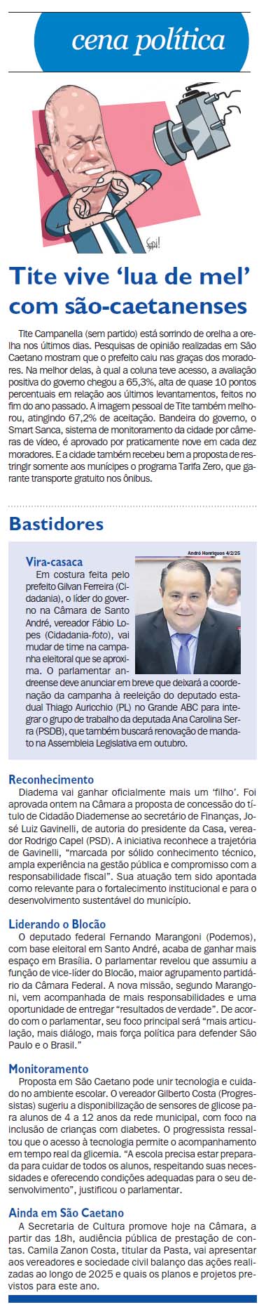 Coluna Cena Política - Tite vive ‘lua de mel’ com são-caetanenses