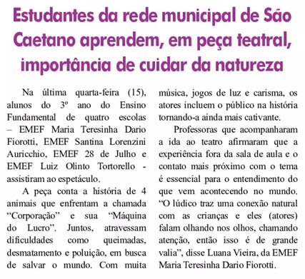 Estudantes da rede municipal de São Caetano aprendem, em peça teatral, importância de cuidar da natureza