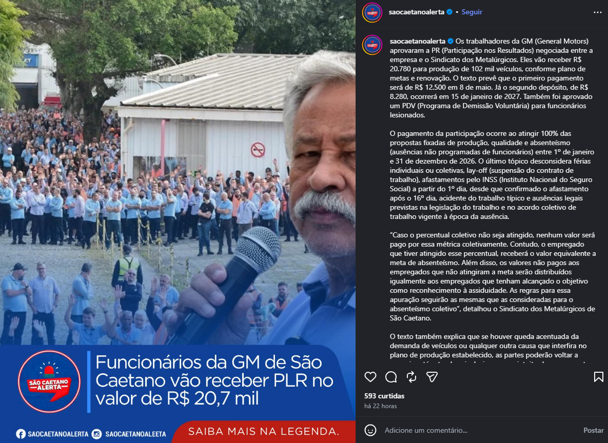 Funcionários da GM de São Caetano vão receber PLR no valor de R$ 20,7 mil